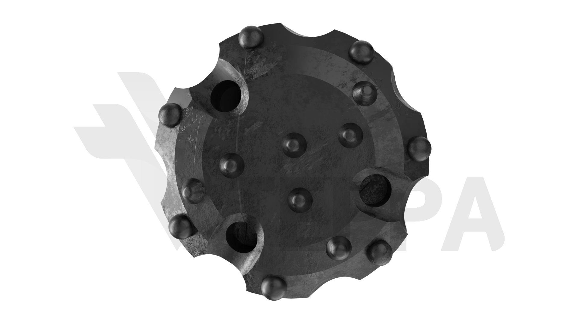 Инструмент для пневмоударного бурения скважин диаметром 90 мм. Оснащена комбинированными твердосплавными штырями и шлицевым соединением для быстрой замены.